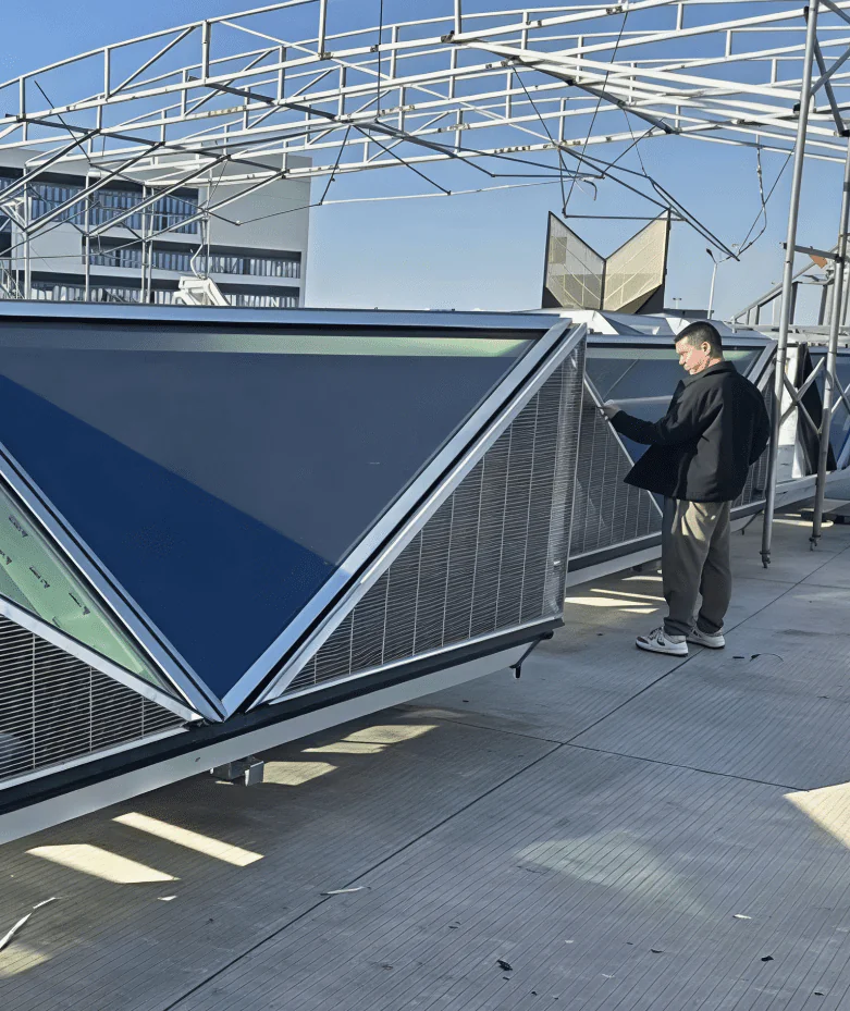 Each louver was meticulously fabricated with ±1mm tolerance, a level of precision that ensures perfect alignment and structural harmony across the entire façade system. The panels achieved an open-area ratio of over 78%, balancing aesthetic lightness with functional ventilation and mechanical strength.
